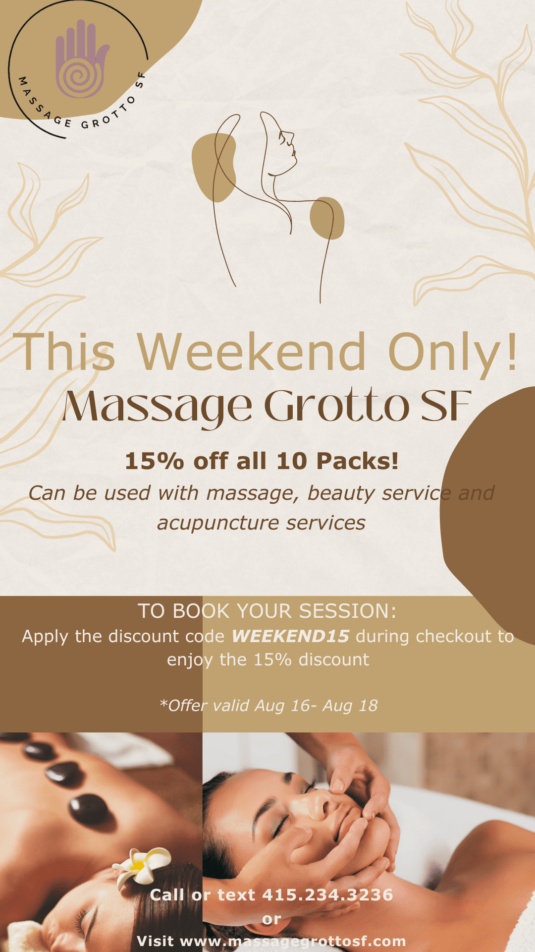 Are you ready to treat yourself to some well-deserved relaxation? At Massage Grotto SF, we’re excited to offer you a special weekend deal that’s perfect for unwinding and rejuvenating. From August 16th to August 18th, you can enjoy a 15% discount on all 10 packs—a fantastic way to indulge in multiple sessions of massage, facials, or acupuncture at a great price!