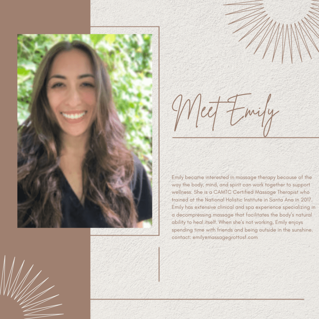 At Massage Grotto SF, we pride ourselves on providing top-quality services to help you relax, rejuvenate, and achieve optimal wellness. One of the key elements of our exceptional service is our talented team of massage therapists. Today, we are excited to introduce you to Emily, one of our skilled and dedicated therapists who is ready to help you unwind and feel your best.