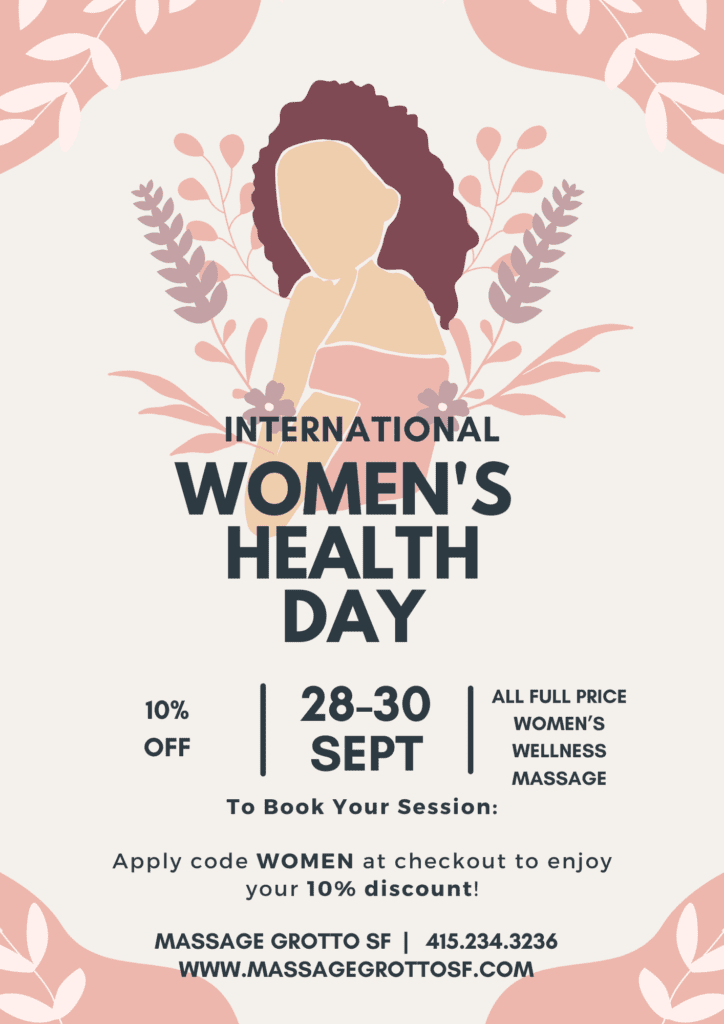 At Massage Grotto SF, we’re here to support your health journey. Take advantage of our special offer and give yourself the gift of wellness this International Women’s Health Day.