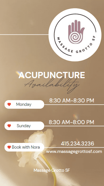 If you’re ready to explore the benefits of acupuncture and experience Nora’s expert touch, we’d love to welcome you to Massage Grotto SF. Whether you’re dealing with pain, stress, or just need a little boost to your overall well-being, we’re here to help you feel your best.