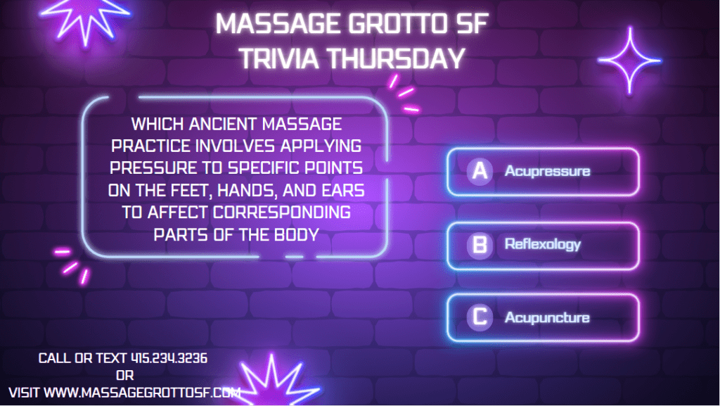 Follow us on social media for more trivia, special offers, and updates on our services. Share your trivia moments with #TriviaThursday and tag @MassageGrottoSF. We can’t wait to see your answers and hear from you!