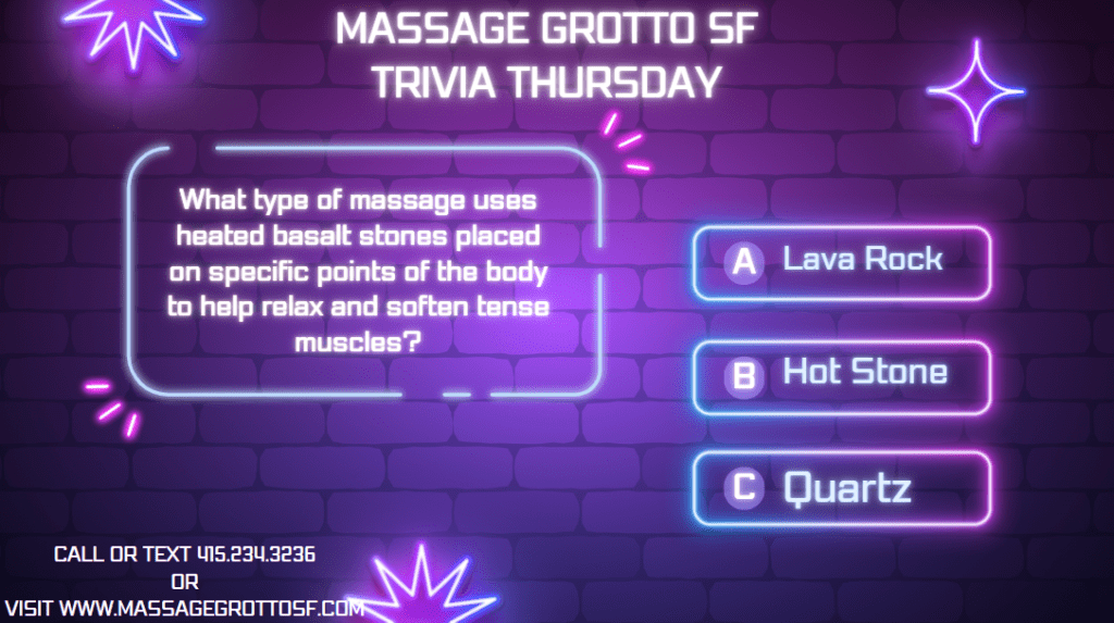 Ready to book your next session? Visit www.massagegrottosf.com or call/text 415.234.3236 to schedule your appointment today—and don’t forget to mention “Trivia Thursday” to claim your prize if you’re the lucky winner!